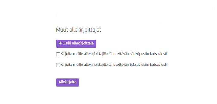Kun täytät sähköistä omistajanvaihdoslomaketta, lisää ”Muut allekirjoittajat” -kohtaan kaikkien kiinteistön omistajien sähköpostiosoitteet allekirjoituspyyntöä varten ennen allekirjoittamista. Ilmoittaja allekirjoittaa lomakkeen viimeiseksi.